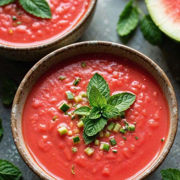 Würzige Tomaten, knackige Paprika und Gurke treffen auf die Süße der Wassermelone und werden zu einer feinen kalten Suppe püriert. Knoblauch, Olivenöl und ein Spritzer Rotweinessig verleihen Tiefe und mediterrane Frische. Nach einer Ruhezeit im Kühlschrank präsentiert sich ein samtiges Gazpacho, das mit seiner Leichtigkeit und dem spannenden Zusammenspiel von süß, herzhaft und säuerlich überzeugt.